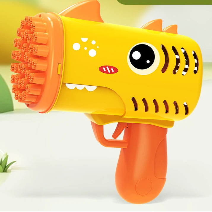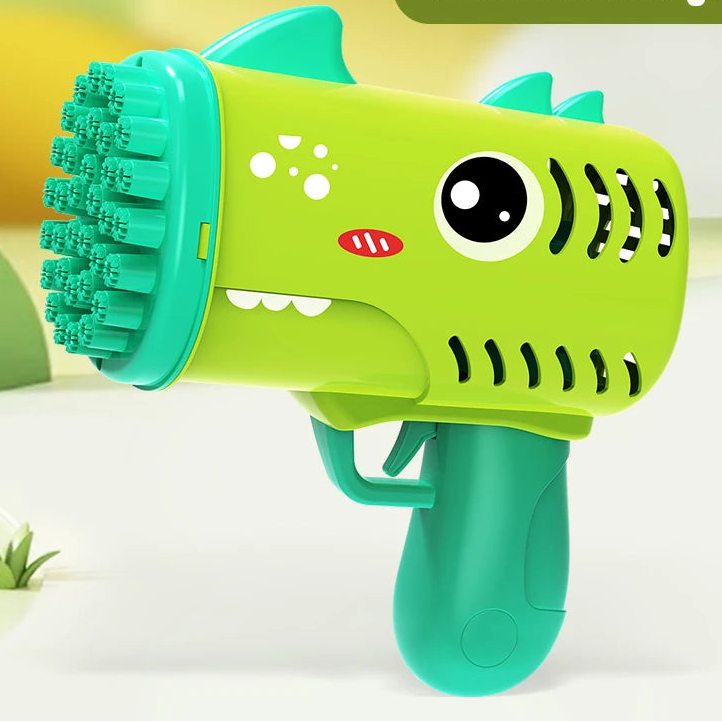 Brinquedo infantil portátil de fazer bolhas com 35 furos, em formato de dinossauro cartoon, elétrico, tipo Gatling, sem bateria e sem líquido de bolhas.